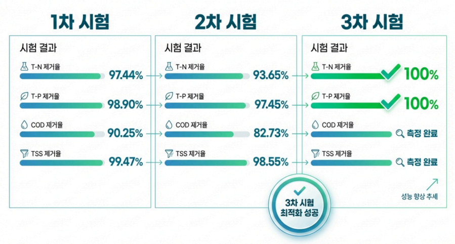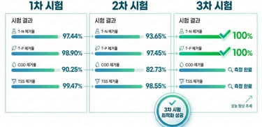 1. T-N 목표 초과 달성: 8 → 0 mg/L (100% 제거, 기준치 완벽 준수)