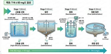 Stage 1: 고도산화 반응 (60분): - 수전해 촉매와 마이크로-나노 버블을 이용한 강력한 유기물 및 질소 산화