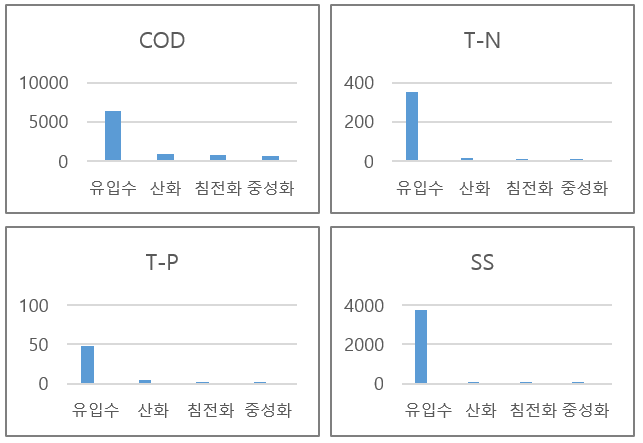 T-N, T-P, COD, SS 등의 항목에 대해 95~99% 수준의 정화효율